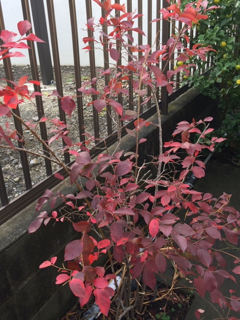 ブルーベリーが赤く紅葉し、姫金柑が黄色く色づき始めました。